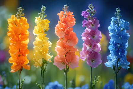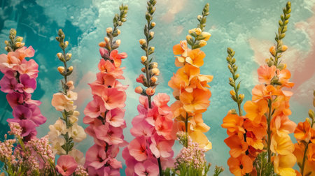 A vibrant display of snapdragon flowers in various colors against a dreamy blue sky backdrop during a sunny day
