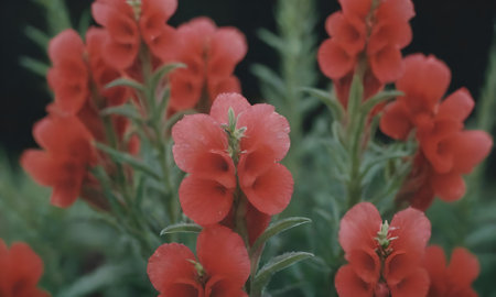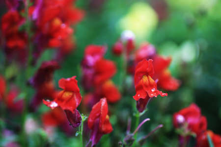 Close-up of red snapdragon flowers in a garden with a blurred background