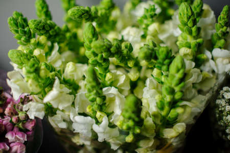 Beautiful bouquet of white freesia with green branches in the transparent wrapping paper