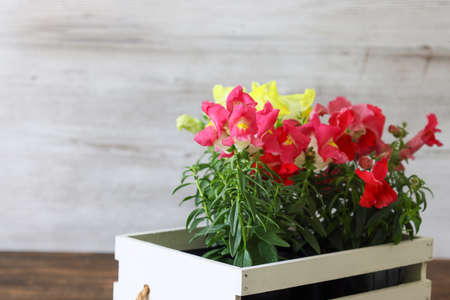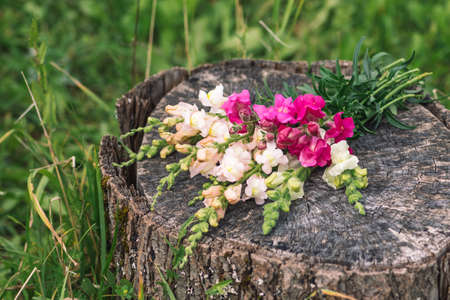 Bouquet of beautiful colorful spring or summer Garden Snapdragon flowers placed on an old tree trunk, close up