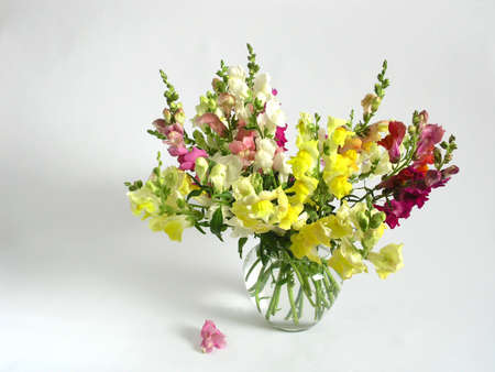 Vibrant floral arrangement featuring colorful snapdragon flowers in shades of pink, yellow, white, and purple against a clean white background