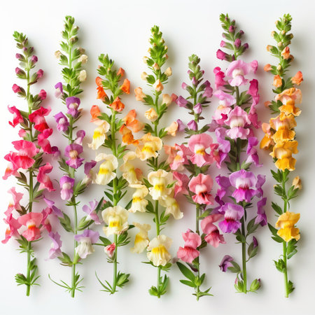 Colorful snapdragon flowers on white background. Flat lay, top view