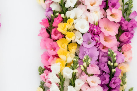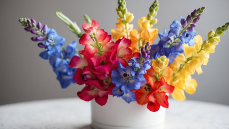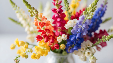 AI Generated. Aerial View of Colorful Snapdragon and Delphinium Bouquet on White Canvas