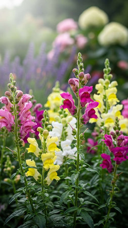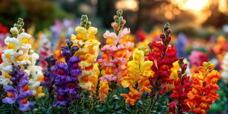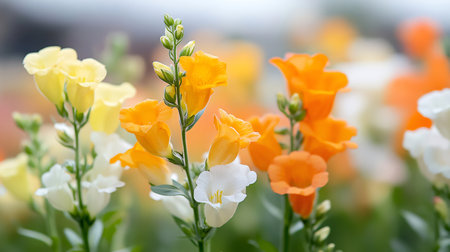Orange, yellow, and white snapdragon flowers create a vibrant display in a garden setting, celebrating the beauty of springtime