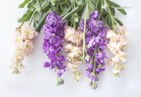 Flat lay of white color Matthiola Incana flowers put on white background for spring flower season concept.