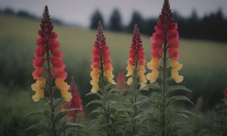 Close up of colorful snapdragon flowers in summer meadow at sunset