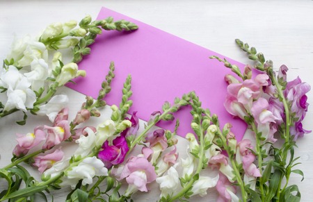 Antirrinum on a white wooden background.Greeting card featuring an envelope.