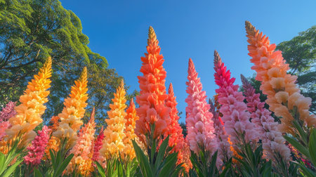 A stunning view of vibrant, colorful flowers reaching towards the blue sky, surrounded by lush greenery. Perfect for nature lovers and gardening enthusiasts.
