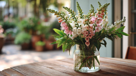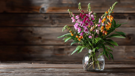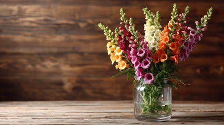 A stunning bouquet of foxglove flowers showcases a vibrant array of colors in a glass vase, set against a rustic wooden backdrop. Perfect for nature lovers.
