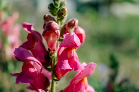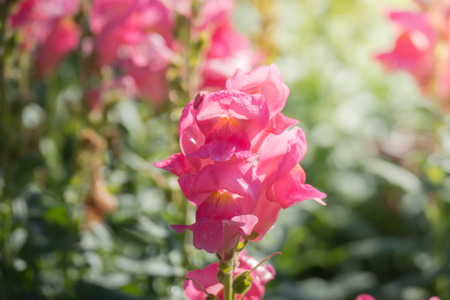 Snapdragon flowers in the garden, antirrhinum majus, pink flower head and blurred background