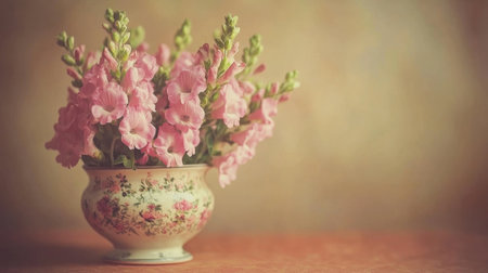 A charming arrangement of soft pink snapdragon flowers in a vintage vase elegantly placed against a textured backdrop, creating a peaceful and serene ambiance for any decorative purpose.