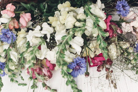 Pink tulips and Snapdragon flowers over shabby white wooden table, with space for text