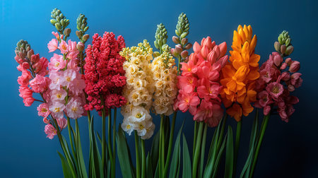 Vibrant flowers in various colors stand tall against a soft focus background. Captured in a serene garden, this image radiates nature's beauty and tranquility.
