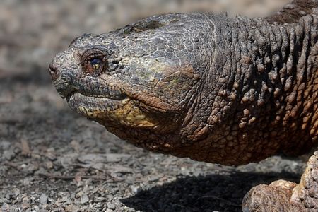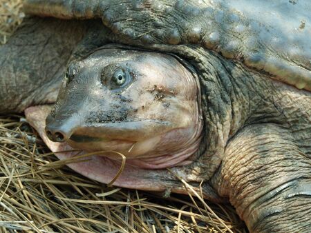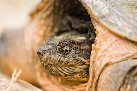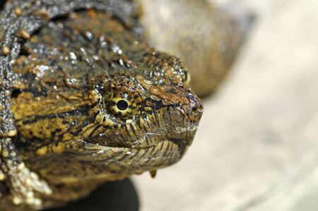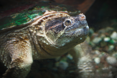 The alligator snapping turtle Macrochelys temminckii is a species of turtle in the family Chelydridae. The species is native to freshwater habitats in the United States. This is close up photo.