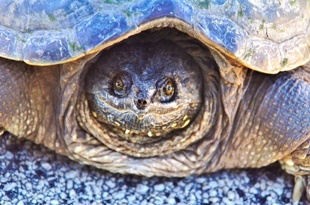Snapping Turtle (Chelydra serpentina) on a gravel road, horizontal
