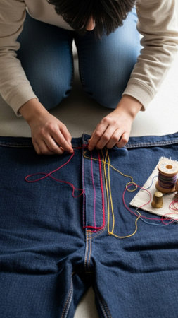 Close-up of person's hands using needle and multicolored embroidery floss to repair torn denim jeans with intricate stitching and vibrant colors