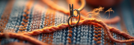Close-up of orange yarn stitching on textured fabric with metal needles. That the image is generated using AI.
