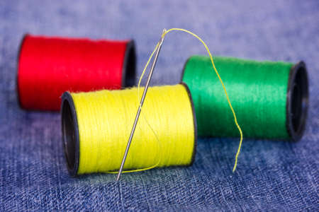 Colorful bobbins with needle on jeans material