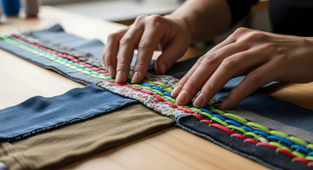 Close-up of hands sewing and arranging colorful strips of fabric on a table. The image highlights the detailed craftsmanship involved in textile design, quilting, or upcycling clothing.