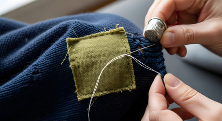 Close up of skilled hands sewing fabric with needle and thread, demonstrating careful garment repair techniques and manual craftsmanship.