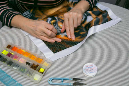 Bead embroidery process. Close-up - female hands string beads on a needle and sew them to the fabric. The woman is fond of embroidery.