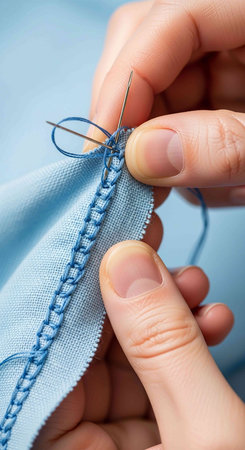 Close up of a woman's hands sewing blue fabric with needle.