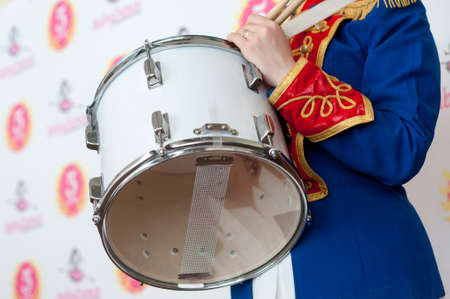 Big drum at a football match. A man with a braban to support football players. White percussion musical instrument.