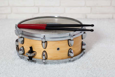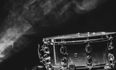 Close-up of a snare drum, percussion instrument on a dark background with haze, beautiful lighting.