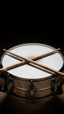 Drumsticks resting atop an uncovered, dusty snare drum, captured in a dramatic, isolated vertical co