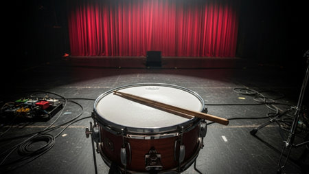 A vivid close-up of a drum surface ready for performance, showcasing a wooden stick poised to create rhythm in a vibrant studio atmosphere. Perfect for music themes.