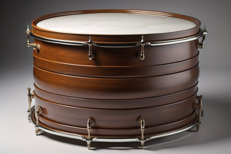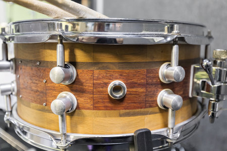 Close-up of a snare drum, percussion instrument on a dark background with beautiful lighting, copy space.