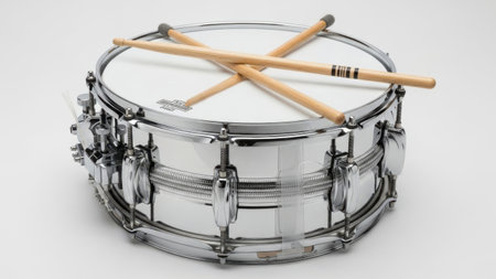 A top view of a round drum features crossed wooden drumsticks, set against a smooth, solid background, representing musical creativity and rhythm.