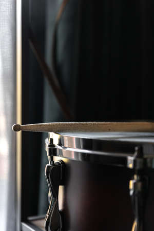 Closeup view of a drum set and Drumsticks in a dark studio. Black drum barrels with chrome trim. The concept of live performances