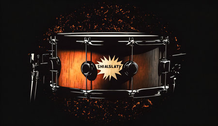 Close-up, snare drum, percussion instrument against a dark background with stage lighting, copy space.