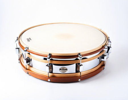 A vivid close-up of a drum surface ready for performance, showcasing a wooden stick poised to create rhythm in a vibrant studio atmosphere. Perfect for music themes.