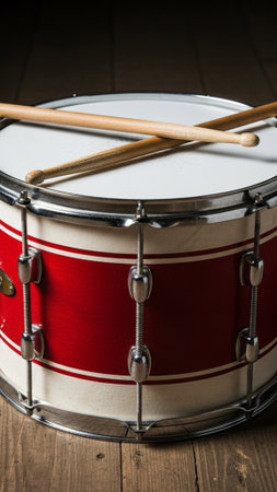 Drumsticks resting against a vibrant red snare drum shell. A vertical, tall (9:16) composition empha