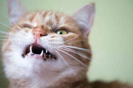 Orange striped cat with open mouth and angry