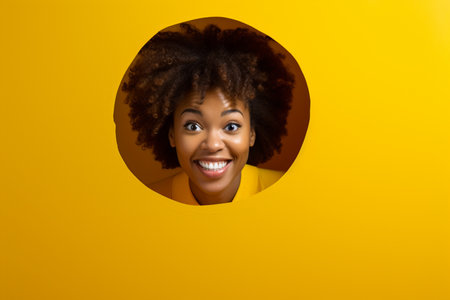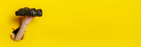 Female hand holds black binoculars on yellow background, travel, find and search concept. Banner