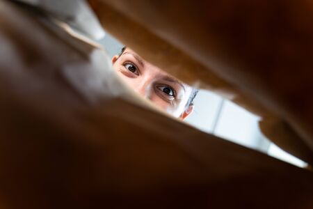 Caucasian woman peeking into craft paper delivery package with happy emotion.