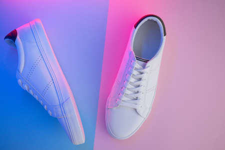 Modern sports shoes over neoned background. Sneakers or trainers isolated. Athletic shoes. fitness, sport, training concept. Urban fashion