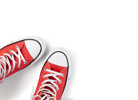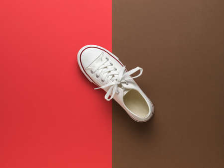 Top view of a white sneaker with laces on a red and brown background. Minimal sports concept. flat lay.