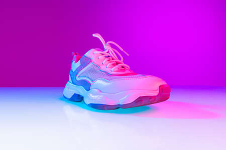 One sports shoe isolated over neoned background. Urban city fashion, fitness, sport, training concept.