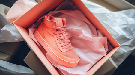 A vibrant coral high-top shoe elegantly presented in a modern box surrounded by soft tissue paper, perfect for showcasing contemporary footwear style.