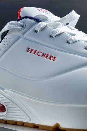 Tyumen, Russia-October 14, 2021: Sketchers shoes white Skechers is an American based footwear company. Vertical photo