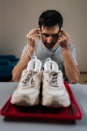 Sports shoes and stereo headphones on brown background. Getting ready for training. top view. flat lay