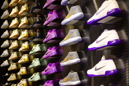 Johannesburg, South Africa - September 12, 2016: Colorful Nike footwears exhibition on black shelf in store of Johannesburg, South Africa. Nike Inc. is an American multinational corporation for the design, manufacturing and worldwide marketing of sportwea