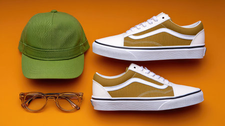 This stylish flat lay showcases casual sneakers, a green cap, and trendy glasses on a vibrant orange background, perfect for modern fashion and lifestyle concepts.