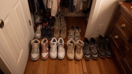 A well-organized collection of sneakers in a closet, showcasing various styles and colors that appeal to fashion enthusiasts and casual wearers alike. Perfect for sneaker culture.
