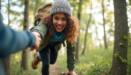 A young man passionately captures a moment with his camera in a lush forest. The image conveys artistic expression and the beauty of nature.