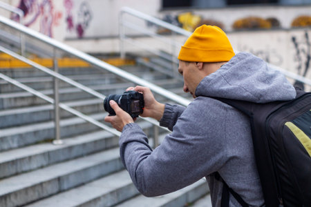 Hipster Photographer Taking Street Pictures With Mirrorless Camera